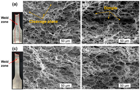 Fracture morphology of the radial sample (a,b) and circumferential sample (c,d) in the WZ (a,c) and the base material zone (BMZ) (b,d).