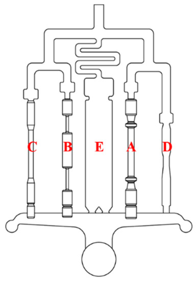 High purity Mg (>99.9%), pure Zn (>99.95%), pure Al (>99.9%), and pure Sn (>99.9%) were used to fabricate alloys. A TOYO BD-350V5 (Toyo Machinery and Metal, Akashi, Japan) cold chamber high-pressure die casting machine was used to prepare a specific casting (as shown in Figure 1). All test samples were extracted from a plate-like bar (part E in Figure 1). The casting parameters adopted were as follows: 7.6 m/s injection speed, 680 °C melt temperature, and 200 °C mold temperature. In slow shot stage, injection speed was 0.25 m/s and 0.4 m/s. Speed was changed to 4 m/s in the fast shot stage. Casting pressure was 70 MPa.