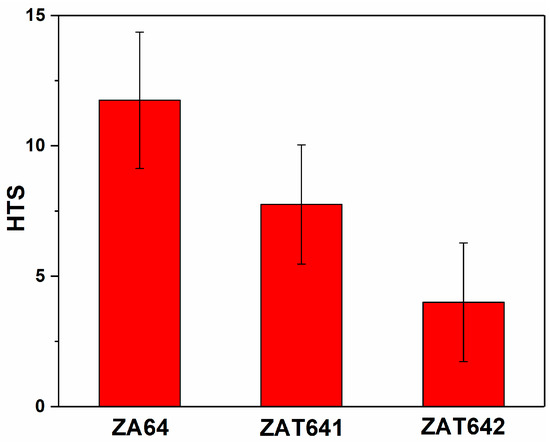 A previous study has pointed out that ZA64 alloys are prone to hot tearing during die casting [20]. For further application of ZA series alloys, the hot tearing susceptibility of the alloys needs to be improved. Figure 2 shows the hot tearing susceptibility of the investigated die cast alloys by addition of Sn content. It is obvious that, with increasing Sn addition to ZA64 alloy, HTS decreases. The typical images of die casting ZA64 and ZAT642 alloys are shown in Figure 3. The cracks in the ZA64 alloy are shown by head arrow in Figure 3a. It can be seen from Figure 3b that there was no obvious crack in the die casting specimen of ZAT642 alloy. It is interesting that Sn addition could significantly improve the hot tearing susceptibility of die casting the ZA64 alloy, which reveals that Mg-6Zn-4Al-xSn alloys are promising for die casting, but the mechanism for the effect of Sn on HTS of the ZA64 alloy will be further studied in another work.