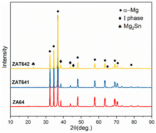 The XRD patterns of the all as-cast alloys are presented in Figure 5. Constituent phases in alloys are mainly α-Mg phases and quasicrystal phases (I-phase). With 2% Sn addition, diffraction peak of Mg2Sn phases could be detected. Generally, when the difference of the electronegativity between different elements is higher, the formation of intermetallic compounds is easier. According to this theory, Mg2Sn phases were easily formed in the Mg-Zn-Al-Sn system referring to the electronegative values of Mg, Al, Zn, and Sn (1.31, 1.61, 1.65, and 1.96, respectively) [14]. However, diffraction peaks of Mg2Sn in ZAT641 alloy cannot be observed, because Sn atoms mostly dissolve into the matrix. Referring to existing literature [24], Mg2Sn phases can easily be detected when the addition of Sn is above 2% in as-cast Mg-Zn-Al alloys, which is consistent with the present work.