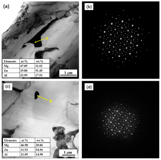 Bright-field transmission electron microscopy (TEM) images of I-phases (a) and (c) in the Mg-6Zn-4Al alloy; (b) and (d) are the corresponding selected area diffraction (SAED) patterns. The insets are the corresponding energy-dispersive X-ray spectroscopy (EDS) results.