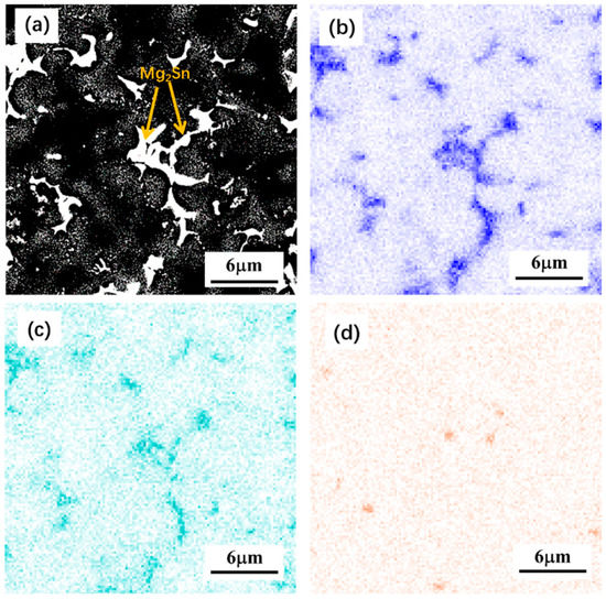 According to EDS mapping results, as shown in Figure 8, the Sn element was mainly distributed in Mg2Sn, and Mg2Sn phases mainly coexisted with the continuous phase. However, Zn and Al elements were mainly enhanced in the I-phase.