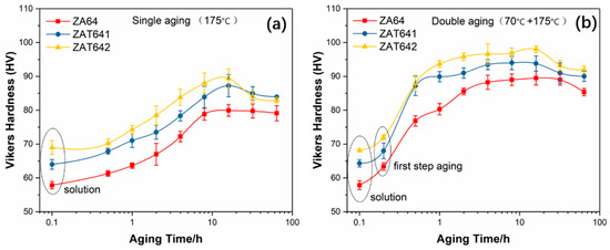 Aging-hardening curves of the Mg-6Zn-4Al-xSn alloys: (a) single aging, and (b) double aging.