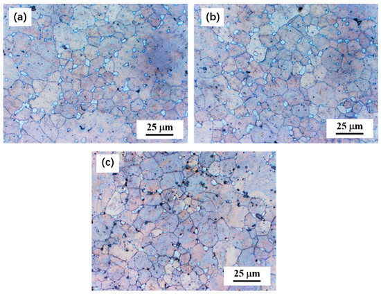 Figure 10 shows the optical micrographs of all double-peak aged alloys. There were still a small number of undissolved intermetallics distributed along grain boundaries and within grains. There was no significant difference in grain size among all double-peak aged alloys.