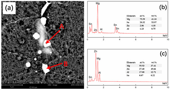From Figure 11a, the SEM image of the double-peak aged ZAT642 alloy shows that some spherical (marked A) and irregularly shaped (marked B) phases were distributed on the grain boundaries and within grains. According to EDS analysis, as shown in Figure 11b,c, spherical and irregularly shaped phases belonged to Mg2Sn and undissolved I-phases, respectively.