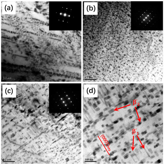 Figure 12 shows the TEM images of all double-peak aged alloys obtained from zone axis. Densely distributed precipitates presented two different morphologies. One was rod precipitates, aligned with the [0001]Mg direction, and the other was coarse plate precipitates, lying on the (0001) basal plane. Rod-like precipitates was identified as β1′ phase, and plate-like precipitates was β2′ phase, which are typical precipitates in the Mg-Zn system. It is commonly known that β1′ has an orientation relationship of // and // with the matrix, and β2′ phase has a// and // orientation relationship [32,33,34]. In the double-peak aged ZA64 alloy, precipitates were coarse and distributed randomly. Adding Sn to the ZA64 alloy resulted in the prominent refinement and homogenous distribution of β1′ and β2′ precipitates, especially with 1% Sn addition. The precipitates in the ZAT641 alloy were much denser and finer than those in ZA64 alloys. The size of the rod-like precipitates was ~60.4 nm and ~6.8 nm in length and diameter, and the diameter and width of the blocky precipitate was ~24.6 nm and ~17.1 nm, respectively, in the double-peak aged ZAT641 alloy.