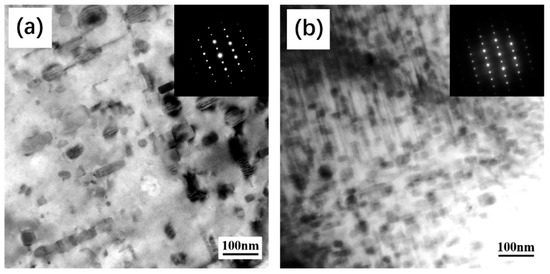 Bright-field TEM images of peak-aged ZAT641 taken from the zone axix: (a) single ageing, and (b) double aging.