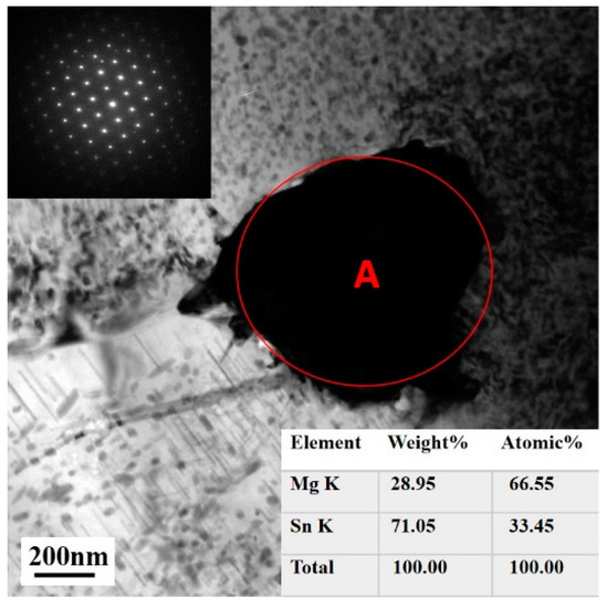 The bright TEM image of coarse particle A, at the grain boundary, in the double-aged ZAT642 alloy is shown in Figure 14. According to the EDS result inserted in Figure 14, particle A can be identified as the cubic Mg2Sn phase. The size of the Mg2Sn phase was about 500 nm, much larger than precipitates. These Mg2Sn phases did not dissolve into the matrix due to their high temperature stability, and they could contribute to the increase of base hardness of the ZAT642 alloy, as shown in Figure 9.