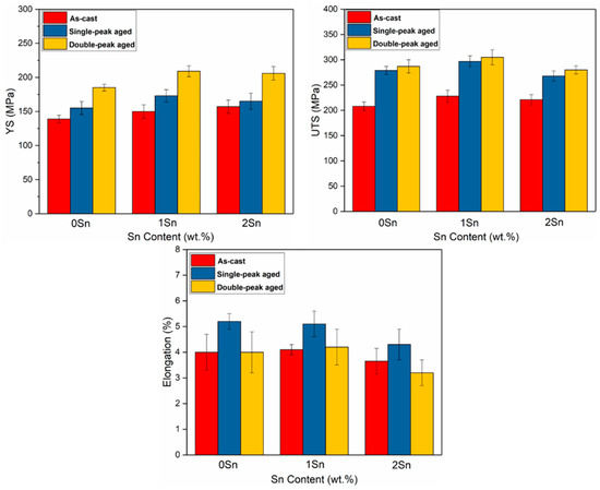 It must also be mentioned that the UTS and elongation of the alloy containing 2% Sn were deteriorated. As it can be seen from Figure 11 and Figure 14, there were coarse Mg2Sn phases and undissolved second phases in the peak-aged ZAT642 alloy, which possibly caused stress concentration and acted as crack initiation sites, causing an adverse effect on the UTS and elongation of the ZAT642 alloy.