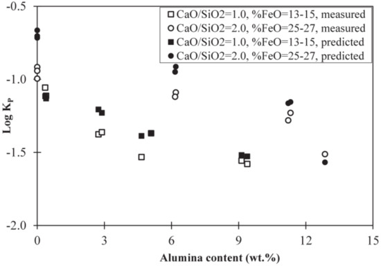 log KP versus slag alumina content for binary basicities of 1.0 and 2.0 at FeO compositions of 13–15 and 25–27 wt.%, respectively, at 1873 K (1600 °C). Solid markers predicted by Equation (5).