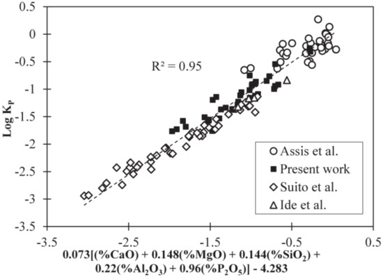 - Evaluate log KP −0.0108(%MgO) as a function of wt.%CaO, wt.%SiO2 and wt.%P2O5 using the data from Suito et al. [4,5], Assis et al. [1], and the present data that did not contain Al2O3. The resulting coefficients are 0.073 for CaO, 0.0105 for SiO2, and 0.070 for P2O5. All p-values were below 0.05. The resulting equation is