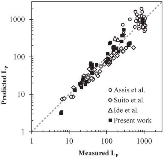 Measured phosphorus partition versus predicted phosphorus partition by Equation (5). Data sets from Suito et al. [4,5], Ide et al. [9], Assis et al. [1], and the present work.