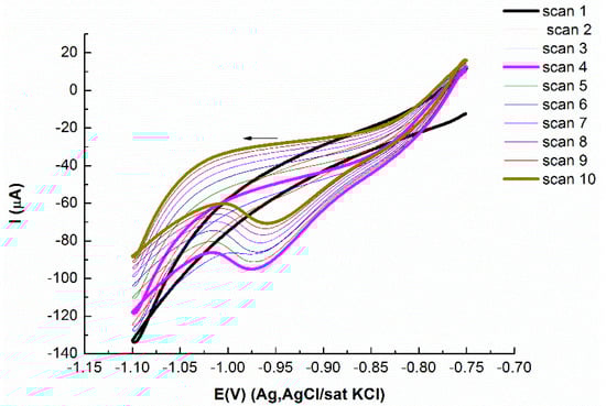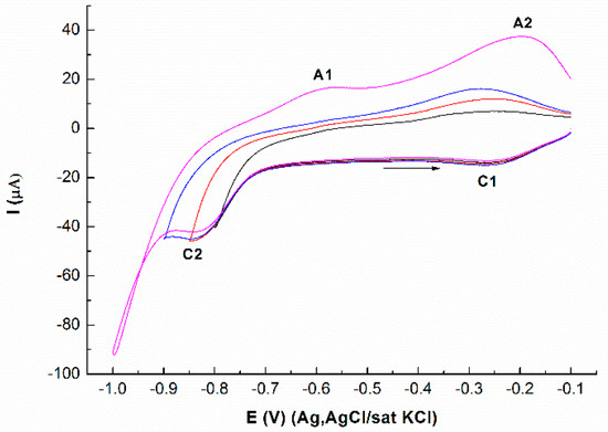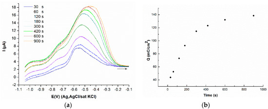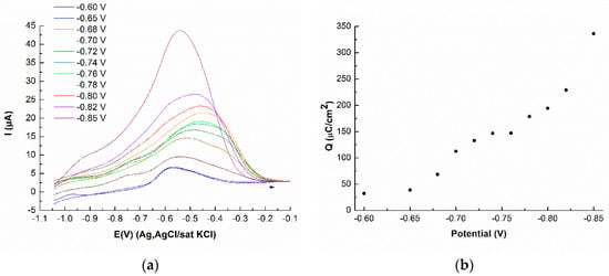 The area of the peak at −1.14 V reached a constant value when performed after 5 min of accumulation time (−0.85 V for 5 min), with the area under the curve being 37.6 µC·cm−2.