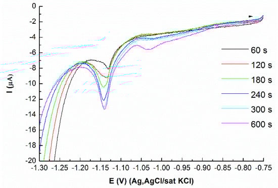 The voltammograms were registered at a more negative potential than the dissolution of Mo. The charge involved in the cathodic peak at −0.97 V reached a limiting value after five scans. In analogy, with what happens on Ag, this peak can be attributed to the bulk reduction of Se(0) to Se(-II) [51]; in our case, in the presence of Mo, this reaction was anticipated at about 30 mV. The positive current at −0.75 V indicates the reoxidation of Se(-II) to Se(0). Then, the procedure to obtain a layer of selenium consists in producing Se(-II) at −1.10 V, keeping constant the potential at −0.85 V for 5 min (to avoid reoxidation of Se(-II), to form Se(0) by comproportionation, and finally a washing step with the solution of the supporting electrolyte at −0.85 V for 1 min to reduce bulk selenium. Figure 5 shows cathodic stripping curves of the deposited Se as a function of the accumulation time, at a constant concentration and deposition potential.
