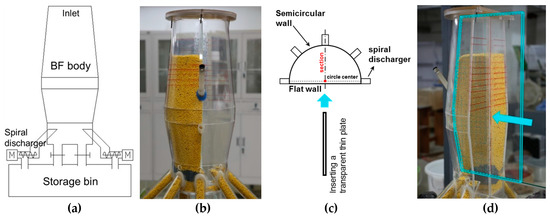 For the last step, in the process of the cutting method, the plate was instantly inserted into the burden with a short time. As shown in Figure A3, an experimenter held the BF model, and the other experimenter pushed the transparent thin plate into the burden. The plate slides into the burden along the preset chutes on the upper and lower sides of the BF body. At last, the solid particles on the one side of the transparent plate were removed, and the internal surface was exposed, as shown in Figure A3b.