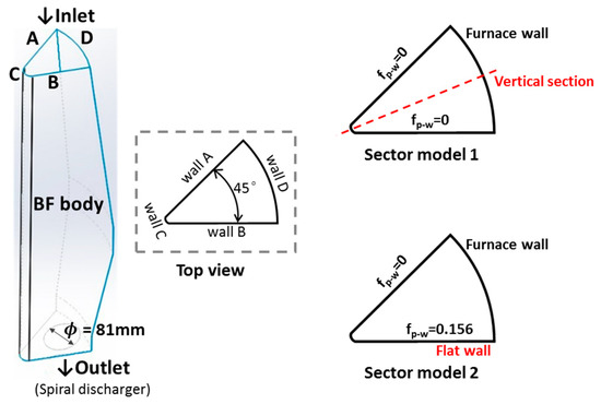 The DEM method by EDEM commercial software (EDEMTM, version 2018, DEM solutions, Edinburgh, England) was adopted to simulate the solid flow in the experimental BF model. Since the BF possesses an axisymmetric structure with eight tuyeres on the lower part of the wall, two 3D sector models of a one-eighth circle (45° as shown in Figure 2) were constructed by considering the efficiency and accuracy of calculation. As shown in Figure 2, in the sector model 1, the wall effect was eliminated (i.e., each fp-w is set as zero). Meanwhile, in the sector model 2, the wal -effect was considered (i.e., one of fp-w was set as 0.156). Additionally, in the DEM simulation, the internal angle of the sector was adjusted to a round arc of 5 mm diameter as shown by the cross-section wall in Figure 2, which can weaken the friction effect of the acute angle.
