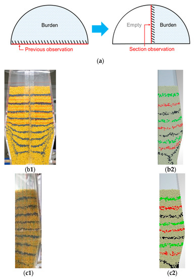 Figure 3a shows the section observation by the cutting method. The distributions of burden particles and tracer particles in the 3D half-circle BF model were observed through the vertical section after cutting. As shown in Figure 3b, the solid flow in the bosh region, which was observed from the flat wall, appears as an obvious “W”-shaped convergence flow. Furthermore, in order to further study the solid flow patterns in the BF, the vertical section of the solid flow in the 3D half-circle BF model was observed. Figure 3c1 shows the distributions of burden particles and tracer particles in the 3D half-circle BF model observed through the vertical section after cutting. Clearly, there is a significant difference in the timelines of tracer particles with the results shown in Figure 3b1,c1. Meanwhile, as shown in Figure 3c, the timelines which were observed from the vertical section of solid flow after cutting show approximate straight lines in the shaft area and oblique lines in the bosh area. Compared with the literature [25], there is a longer bosh in this work. The result of the flat wall shows a larger quasi-stagnation zone in the bosh, which illustrates that the shape and length of the bosh can affect the shape of this quasi-stagnation zone. In the hearth region, the experimental result in Figure 3c1 shows that more inclined lines exist in this region, which is different from the results in the literature (the curved lines) [25]. Evidently, the plug flow zone can be extended to the middle of the bosh area. As for the phenomena shown in Figure 3b1, it is likely that, due to the 90° angle between the flat and semicircular walls, the increase in particle velocity at the center and the decrease in particle velocity near the wall led to a long “W” shape in the gradually narrowed bosh region. In addition, it can be found that a vertebral-body deadman exists at the center of the hearth region, and thus, the W shape was obvious at the bottom of the BF model. However, as for the phenomena shown in Figure 3c1, it can be found that when the wall effect was eliminated using the cutting method, the plug flow zone covers most of the area in the BF, which agrees well with the observation shown in the 3D full-circle BF model [27].