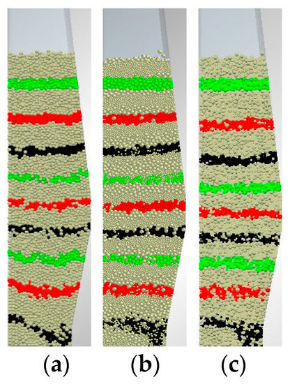 Similarly, Figure 3c2 shows an image obtained through the vertical section of the solid flow in the 3D half-circle BF model simulated by sector model 1 via DEM. Evidently, by comparing with the results shown in Figure 3b2, it can be found that, when the wall effect was eliminated, the plug flow is dominant in the BF. Accordingly, the results shown in Figure 3 indicate that only the vertical section of the solid flow can reflect the actual situation of the solid flow due to the elimination of the wall effect. Therefore, in future experiments and simulations, the vertical section of the solid flow should be used to analyze the characteristics of the plug and convergence flows, which is consistent with the literature [25,26]. The experimental cutting method can solve the problem of the wall effect on the burden descending in shaft furnaces, which might have important implications for various industrial applications [24,25,26,27].