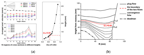 Figure 5. (a) Averaged axial velocity in 10 regions at different heights of the BF, and the (Uws) distributions along the height of the BF. (b) The boundary between the plug flow and convergence flow in the BF, which was determined by Uws.