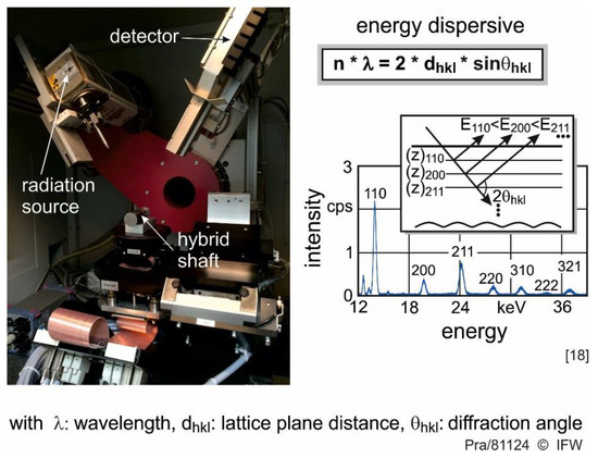 The X-ray diffraction (XRD) sin²ψ method for lattice strain measurement is based upon the well-established Braggs’s law [16]. One condition in order to analyze the modification of residual stress depth profiles by the machining process is their non-destructive measurement. Energy-dispersive residual stress determination is an appropriate method to identify non-destructively residual stress depth profiles. The information depth is certainly limited depending on the measured material. In steel shafts, a residual stress depth information up to 35 µm and in aluminium alloy up to 300 µm are possible. However, these information depths are sufficient to capture changes in residual stress depth profiles [17,18].