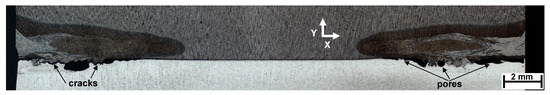 Metallographic cross section of a dissimilar steel-aluminium alloy weld (cracks and pores exemplarily marked).