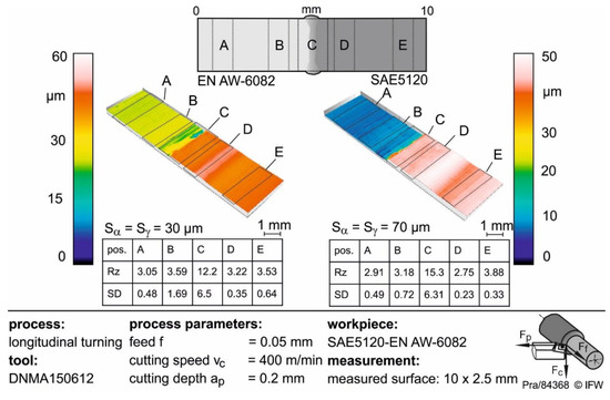 Surface quality and surface roughness of turned steel–aluminium alloy shaft subjected to different cutting edge roundings are shown in Figure 11. The measurements were carried out both in the base material area (pos. A, B, D and E) and in the joining zone area (pos. C). Surface height difference in the material transition zone increases by using a larger cutting edge rounding which is observed by the topography pictures. Surface roughness Rz decreases in average with increasing cutting edge rounding as the contact length with the component surface grows. This in turn leads to a reduction of roughness peak heights. In the HAZ in both surfaces an increase of surface roughness is noticeable compared to the base material. The reason for this is on the one hand different machining behaviour by cutting materials with different properties in the transition zone as well as changes in the chip formation and the appearance and variation of built-up edges by passing different materials or the welding seam. Despite that, a shape deviation in the area of the joining zone is noticeable. The elevation in the transition zone is according to the tool displacement due to the hardness differences in the welded area. These results also correlate with the previous results of process forces and seem reasonable.