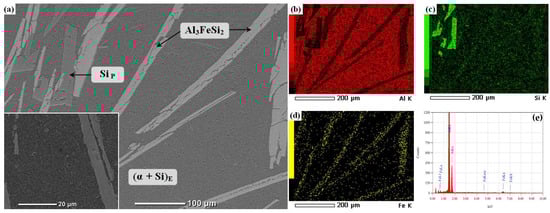(a) Backscattered electron image of the Al–20Si–5Fe master alloy, eutectic microstructure as insert. Elemental mapping of (b) aluminum, (c) silicon, (d) iron, and (e) Energy Dispersive X–ray Spectroscopy pattern. Sip = Primary silicon, (α+Si)E = Eutectic.