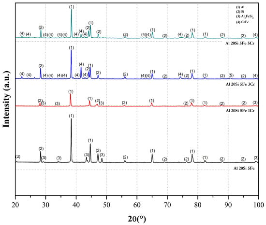 Figure 2 shows the diffraction patterns of Cr additions in the Al20–Si5–Fe master alloy. Three phases were observed, agreeing well with the results shown in Figure 1. It is worth mentioning that as the amount of Cr additions increased, an additional σ-CrFe phase was observed (s.g. (136) a = b = 8.796 Å, c = 4.561 Å) [].