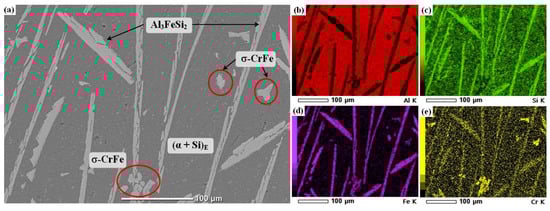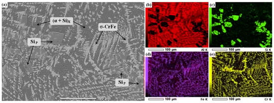 (a) Backscattered electron image of AlSiFe with 5 wt. % Cr alloy. Elemental mapping of (b) aluminum, (c) silicon, (d) iron, and (e) chromium. Sip = Primary silicon, (α+Si)E = Eutectic.