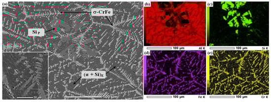 (a) Backscattered electron image of AlSiFe with 3 wt. % Cr, eutectic microstructure as insert. Elemental mapping of (b) aluminum, (c) silicon, (d) iron, and (e) chromium. Sip = Primary silicon, (α+Si)E = Eutectic.