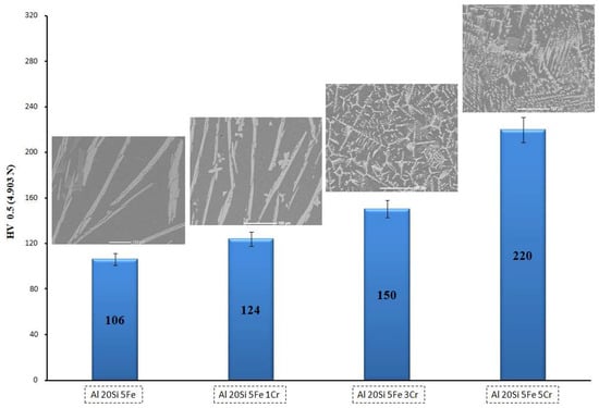Microhardness of the Al–20Si–5Fe alloy with several Cr additions.