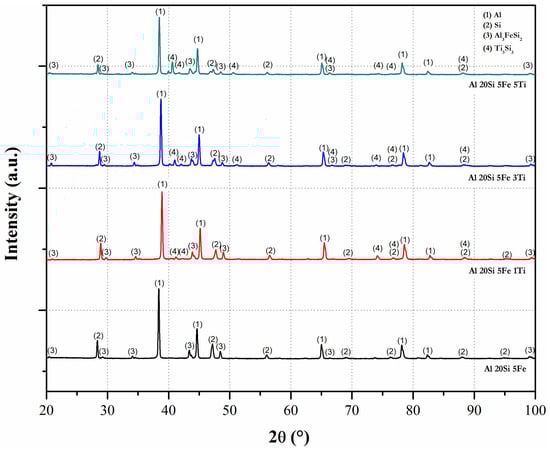 X-ray diffraction pattern of the Al–20Si–5Fe masters alloy and the Ti additions.