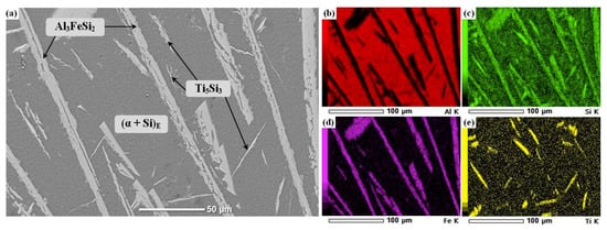 (a) Backscattered electron image of AlSiFe with 5 wt. % Ti alloy. Elemental mapping of (b) aluminum, (c) silicon, (d) iron, and (e) titanium. (α+Si)E = Eutectic.