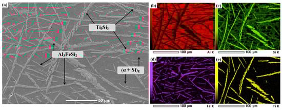 Figure 8 shows the microstructures of the Al–20Si–5Fe with 1 wt. % Ti addition. Here, it is evident the formation of a new acicular Ti5Si3 compound (Figure 9e). However, with this amount of Ti, the X-ray Bragg peaks are rather weak for this phase.