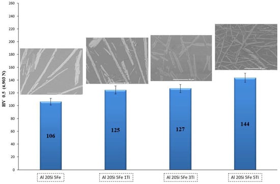 Figure 7 shows the diffraction patterns of Ti additions in the Al20–Si5–Fe master alloy. As the amount of Ti additions increases, an additional Ti5Si3 phase (s.g. (193) a = 7.4440 Å, c = 5.1430 Å) was promoted []. The results presented in this section will show the microstructure evolution as a function Ti content (above 1 wt. %) and its effect on the hardness behavior.