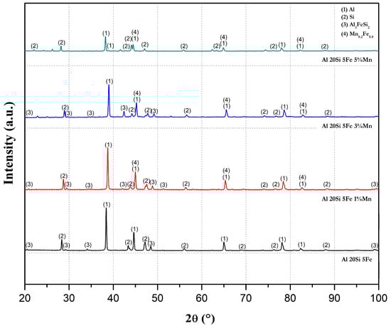 X-ray diffraction pattern of the Al–20Si–5Fe masters alloy and the Mn additions.