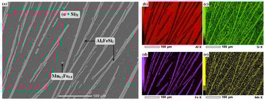 (a) Backscattered electron image of AlSiFe with 1 wt. % Mn alloy. Elemental mapping of (b) aluminum, (c) silicon, (d) iron, and (e) manganese. (α+Si)E = Eutectic.