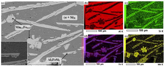 (a) Backscattered electron image of AlSiFe with 3 wt. % Mn alloy, eutectic microstructure as insert. Elemental mapping of (b) aluminum, (c) silicon, (d) iron, (e) manganese. (α+Si)E = Eutectic.