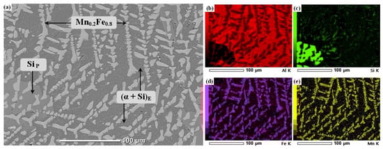 (a) Backscattered electron image of AlSiFe with 5 wt. % Mn alloy. Elemental mapping of (b) aluminum, (c) silicon, (d) iron, and (e) manganese. Sip = Primary silicon, (α+Si)E = Eutectic.