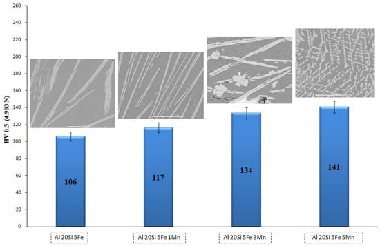 Figure 16 shows the effect of the Mn additions on the Al–Si–Fe master alloy. It can be seen that the microhardness increased as a function of Mn concentration. It is clear that the microhardness, in general terms, for these alloys, is a consequence of the average hardness of all phases involved in the microstructure. In particular, the formation of the primary Si (1517 ± 193 HVN). For the 5 wt. % Mn alloy this phase was the main responsible of such microhardness increment.