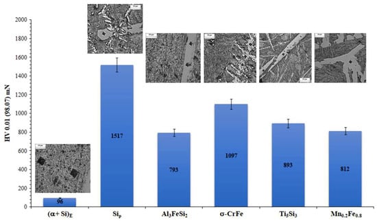 Figure 17 shows the microhardness values for each phase that was determined in this work. It is worth mentioning that the alloying elements generated different microstructures and compounds in the studied alloys. For instance, a dendritic shaped microstructure (σ-CrFe) was observed for the Cr containing samples. The alloy with 5 wt. % Cr showed the highest Vickers hardness of the whole set of alloys produced. It is thought that the formation of σ-CrFe, Sip, and the microstructure refinement caused such increment. For the alloys with Ti, an acicular (Ti5Si3) morphology was identified and for those alloys. The increment in hardness was not linear with respect to the Ti additions, perhaps the formation of a softer α–Al rich phase contributed to this behavior. With the Mn additions, the microstructure observed moved from a well-defined needle shaped morphology to a “fractured bone” one (Mn0.2Fe0.8). Analogously, the Mn0.2Fe0.8 and Ti5Si3 phases played an important role in the hardness increment for the alloys with Mn and Ti, respectively. The microhardness for each specific alloy was highly dependent on the compound (phase) formed during the solidification. The highest value of microhardness (>1500 HVN) was obtained for the primary Si (Sip) and the lowest values was 96 HVN for the eutectic matrix.
