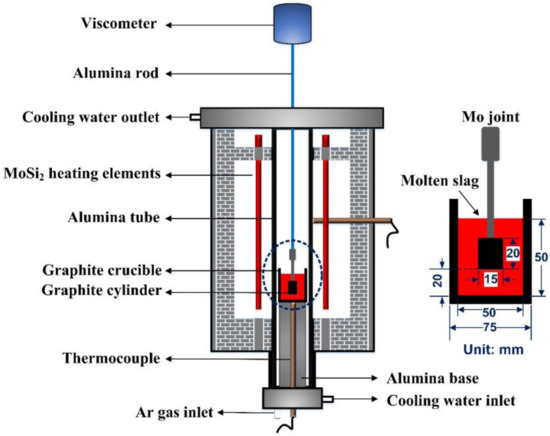 Viscosity was measured using a rotation viscometer. The experimental apparatus (Chongqing Safety Production Scientific Research Co., Ltd., Chongqing, China) for viscosity measurement is shown in Figure 1. A high-temperature furnace with U-shape MoSi2 heating elements is monitored by a B-type thermocouple and a proportional-integral-derivative (PID) controller to ensure that the deviation of temperature in the uniform temperature zone can be maintained within ±2 °C. Before the viscosity measurement, crucible and cylinder were set along the axis of the viscometer, and a calibration measurement was carried out at room temperature by using castor oil of known viscosity. Then, the furnace was heated to the experimental temperature (1400 °C) and held for 10 min to stabilize the temperature and homogenize the slag melt under an Ar gas atmosphere (flow rate: 0.5 L/min). After that the cylinder was carefully immersed into molten slag just 20mm above the bottom of graphite crucible and rotated at a speed of 12 rpm. When the signal from viscometer became stable, the furnace was cooled at a rate of 6 °C/min and the viscosity measurement started and lasted until the value of the measured viscosity reached nearly 3 Pa·S. In the end, the furnace was reheated to 1400 °C at a speed of 15 °C/min to pull out the cylinder and pour out the molten flux.
