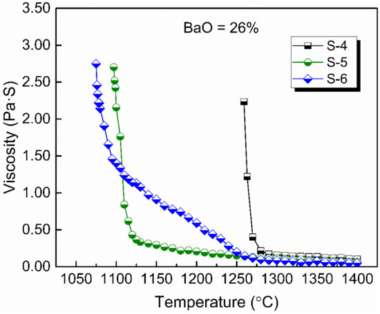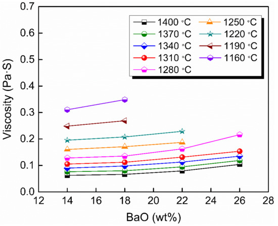 It should be noted that the substitution with BaO for CaO was performed by equal weight in mass. As the molecular weight of BaO is much greater than that of CaO, the free oxygen (O2−) and charge compensation cations in the slags decreased after the substitution, which may also be a potential reason for the increase in viscosity.