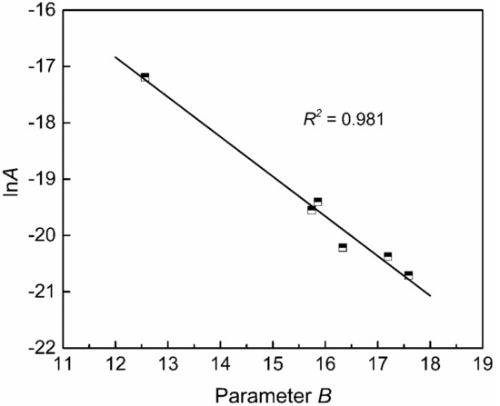 Figure 10 shows the relationship between the new optical basicity and parameter B calculated from the measured viscosity by Equation (7). Their relation can be fitted by a quadratic polynomial with a determination coefficient of 0.972, as shown in Equation (9). The parameters B and lnA are in a linear relationship, as shown in Figure 11, which can be expressed by Equation (10) with a determination coefficient of 0.981.
