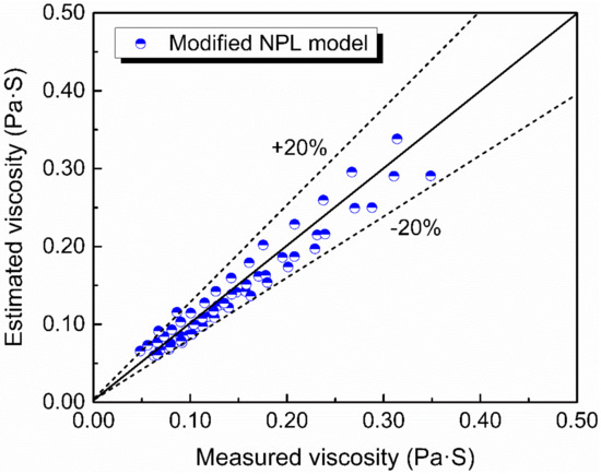 The estimated viscosity against the measured viscosity using modified NPL model.