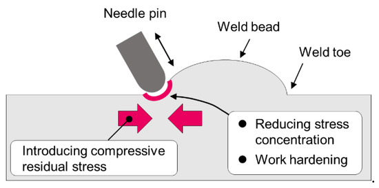 Recent studies showed that the fatigue strength of welded joints could be improved via weld toe treatments, such as needle peening (NP) [1,2] and high-frequency mechanical impact (HFMI) [3,4,5,6,7,8]. NP and HFMI introduce beneficial compressive residual stresses in the surface layer around the weld toe by repeatedly striking the surface with a needle pin, as shown in Figure 1. In addition, applying these methods results in work hardening and reduces the stress concentration at the weld toe.
