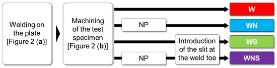 Figure 3 shows the flow chart of the specimen preparation procedure and the types of specimens used for the fatigue test. Four groups of specimens were prepared, which were namely the welded specimen (W), NP-treated welded specimen (WN), welded specimen with a semicircular slit at the weld toe (WS) and NP-treated welded specimen with a semicircular slit at the weld toe (WNS).