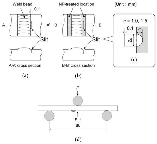 Overview of the slit and loading point: (a) position of the slit with respect to the weld bead; (b) position of the slit with respect to the weld bead and the location of the NP treatment; (c) shape and dimensions of the semi-circular slit where a is the slit depth; and (d) relationship between the slit position and loading point.