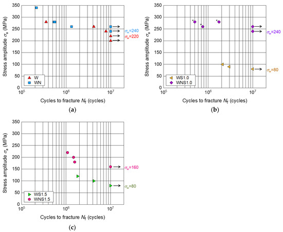 S-N diagram of (a) W and WN, (b) WS1.0 and WNS1.0 and (c) WS1.5 and WNS 1.5. The S-N diagram plots nominal stress amplitude (σa) against cycles to fracture (Nf). Three-point bending fatigue tests were performed with load control. The span length of the three-point bending was 80 mm. All tests were performed at a stress of R = 0.05 and a frequency of f = 20 Hz. The fatigue test was terminated after 1 × 107 cycles. The asterisks (*) indicate that a fatigue crack occurred at a different location compared to the slit. Fatigue limits σw for each type of the specimen were indicated outside the frame of the graph.