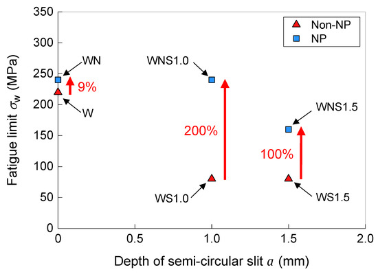 In terms of the effect that the semicircular slit had on the fatigue limit, the fatigue limits of WS1.0 and WS1.5 were reduced by 64% compared to that of W. Furthermore, the fatigue limit was significantly lower due to the introduction of a slit, which resulted in a fatigue limit that was less than half that of W. However, the fatigue limit of the specimen treated with NP and WN was 9% higher than that of W. Moreover, the fatigue limits of WNS1.0 and WNS1.5 (i.e., the specimen with a slit treated by NP) were 100% and 200% higher than those of the specimen with a slit but without NP treatment, WS1.0 and WS1.5. The increased fatigue limit of the NP-treated sample with a slit (WNS1.0) was the same as that of the NP-treated sample without the slit (WN). NP remarkably affected the improvement of the fatigue limit for the welded specimen that contained a 1.0-mm-deep slit.
